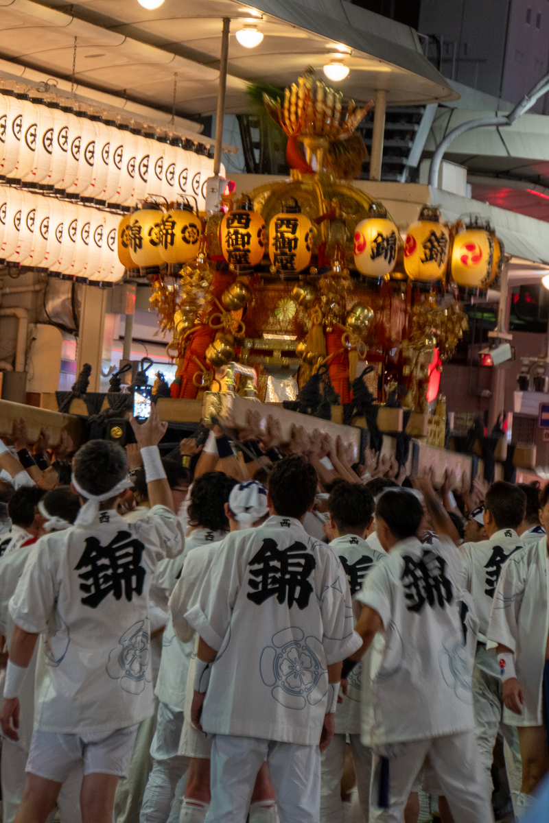 先行している東御座神輿が御旅所で神事をやっている間に待機する西御座神輿の前を、帰路につく宮本組さんが通るので道を開けておられるところ