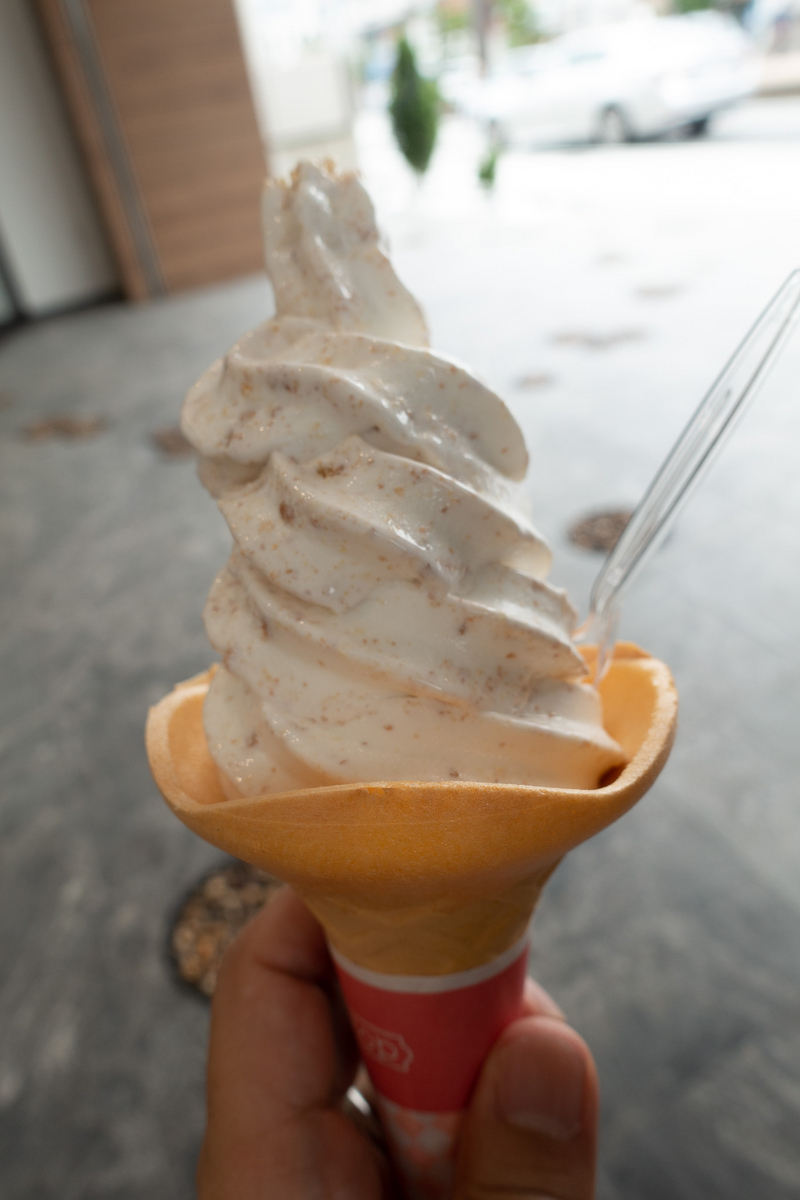 暑い日中、店先のベンチに腰掛けて冷たいソフトクリームを食べる至福のひととき。